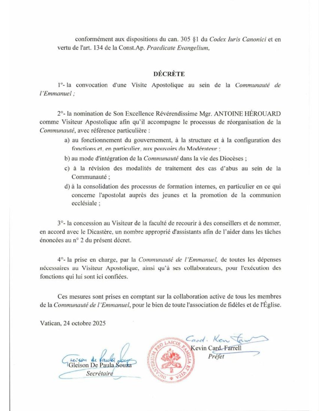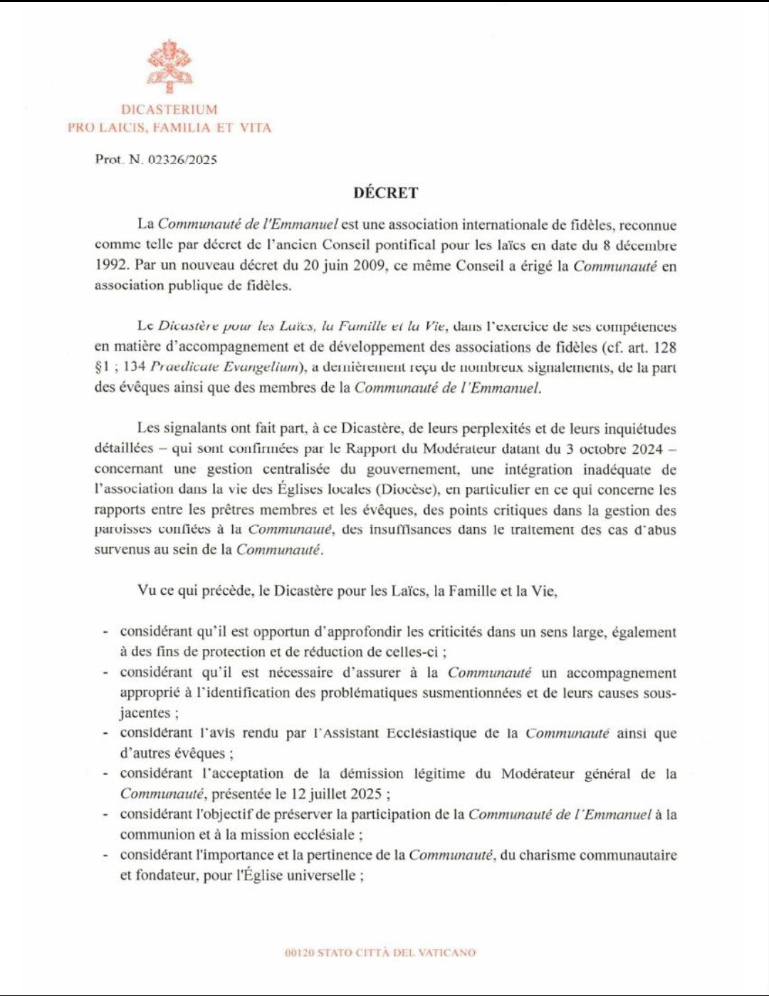 Le Dicastère pour les Laïcs, lu Famille et la Vie, dans l'exercice de ses compétences en matière d'accompagnement et de développement des associations de fidèles (cf. art. 128 $1 ; 134 Praedicate Evangelium), a dernièrement reçu de nombreux signalements, de la part des évêques ainsi que des membres de la Communauté de l'Emmanuel.