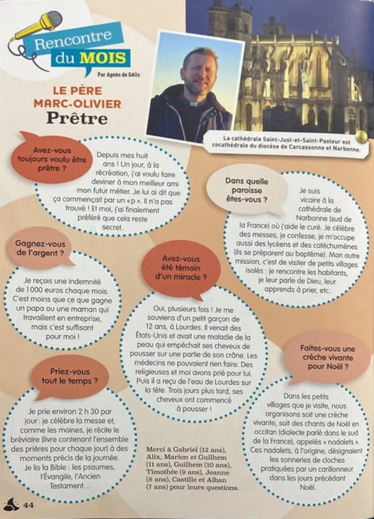 Je suis la rédactrice en chef de Théophile et bien évidemment nous n'étions pas au courant de ces éléments : l'interview a été réalisée tout début avril 2025 et le texte finalisé fin avril. Nous sommes profondément meurtris de cette information et je présente personnellement toutes mes excuses, au nom de l'équipe, à ceux et celles qui auraient été touchés par des agissements de cette sorte. Ce que nous proposons aux enfants c'est un élan vers le beau, les lecteurs le savent. Sachez que ce n'est pas spécifiquement ce prêtre qui est mis en avant, c'est la mission d'un prêtre que nous souhaitions mettre en lumière pour ce numéro paraissant pour la période de l'Avent et de Noël.
