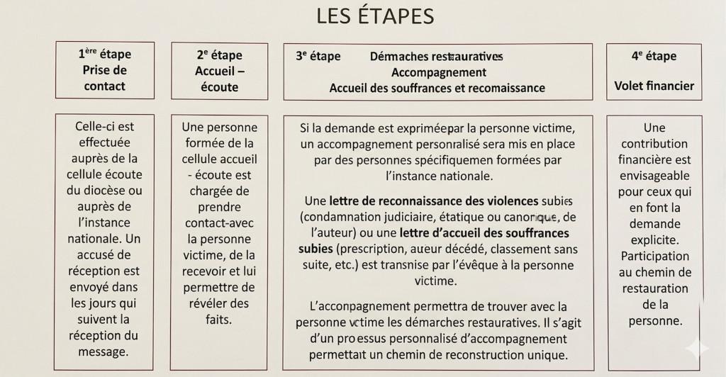 Une lettre de reconnaissance des violences subies (condamnation judiciaire, étatique ou canonique, de l'auteur) ou une lettre d'accueil des souffrances subies (prescription, auteur décédé, classement sans suite, etc.) est transmise par l'évêque à la personne victime.