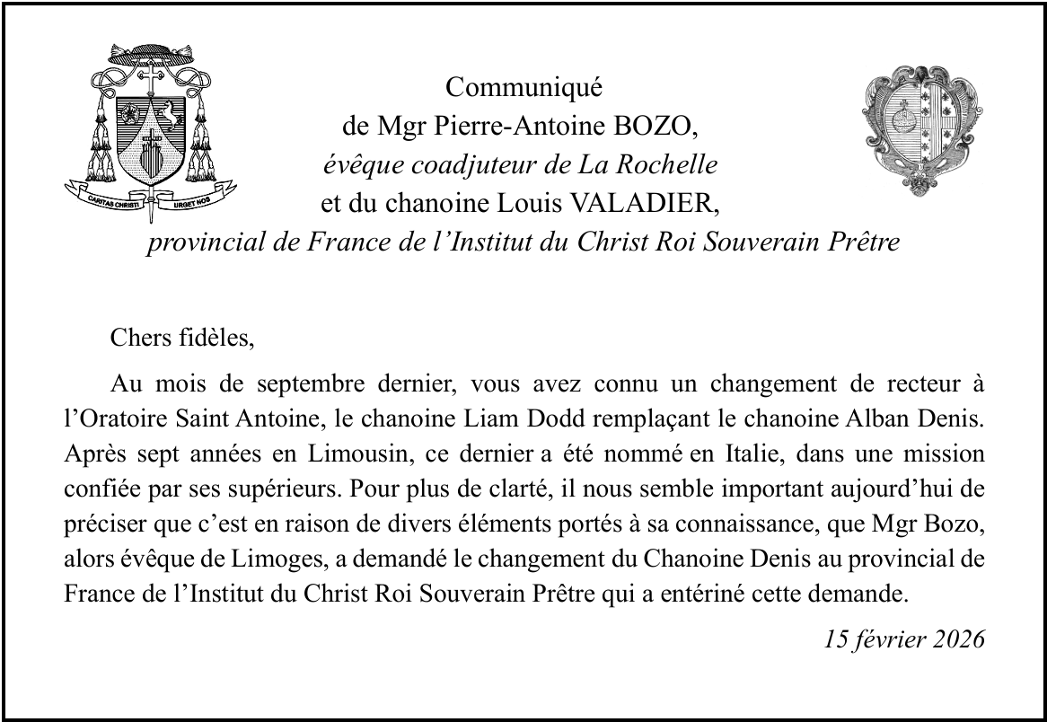 Communiqué de Mgr Pierre-Antoine BOZO et du chanoine Louis VALADIER (15/02/2026)