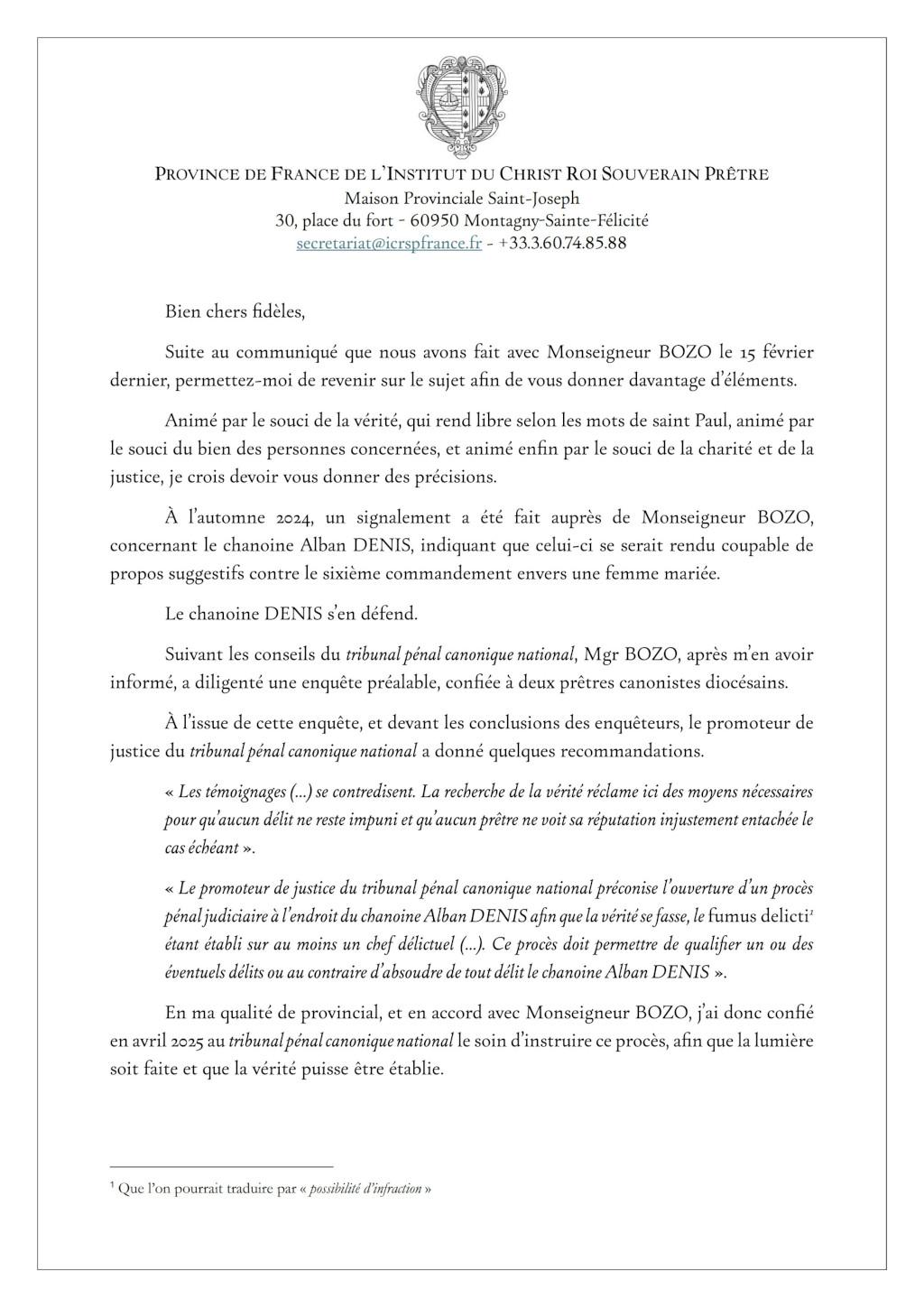 À l'automne 2024, un signalement a été fait auprès de Monseigneur BOZO, concernant le chanoine Alban DENIS, indiquant que celui-ci se serait rendu coupable de propos suggestifs contre le sixième commandement envers une femme mariée.