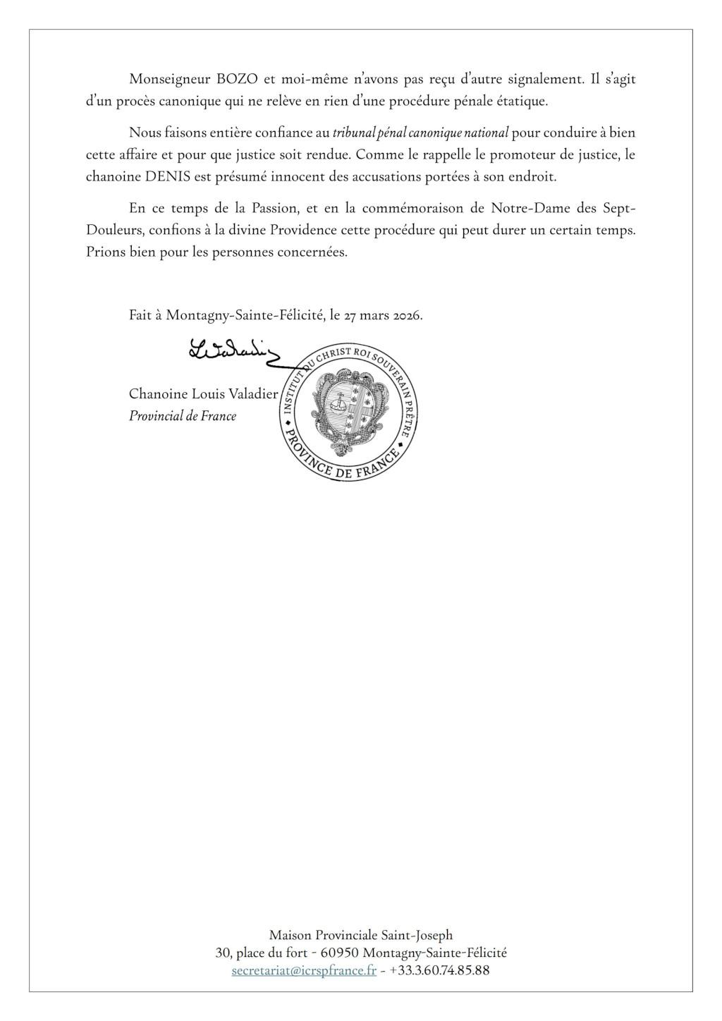 - 2026 Au mois de mars, le provincial de France révèle que le chanoine Denis est accusé « de propos suggestifs contre le sixième commandement envers une femme mariée », ce que ce dernier conteste