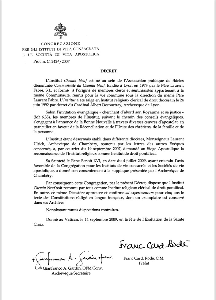 L'Institut religieux CLÉRICAL du chemin neuf regroupe donc par définition, comme le précise sa reconnaissance officielle ci-dessous, les prêtres et séminaristes du Chemin Neuf.